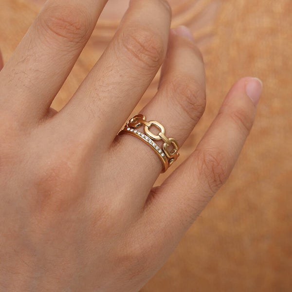 De Mila Chain Ring combineert een moderne chain-structuur met een subtiele rij sprankelende steentjes aan de bovenkant. Een fijne mix van stoer en elegant, licht om te dragen en ideaal voor elke dag. Makkelijk te combineren en geeft elke look een beetje extra sparkle.